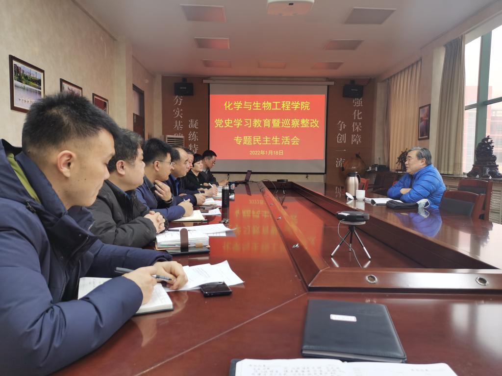 1月18日,化工学院召开党史学习教育暨巡察整改专题民主生活会,校长姚庆国莅临指导。会议由学院党委书记窦存增主持,学院领导班子成员参加会议。