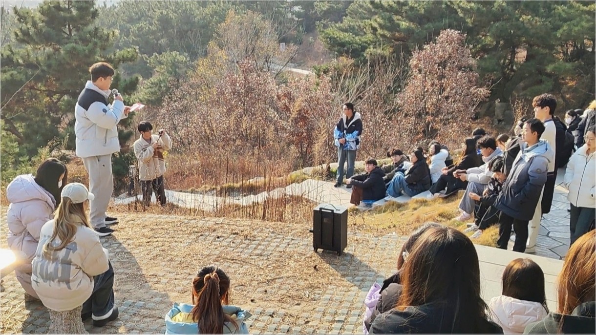 活动尾声,全体师生俯瞰美丽的山科校园,遥望巍巍群山,聆听优秀本科生代表姜昕彤演唱经典爱国歌曲《我爱你,中国》。当歌声与松涛相合,在场师生的情感也随旋律而升华,动情处即随之齐唱,悠扬婉转的歌声在山间回响,爱国爱校的美好情愫在师生心中萦绕,课程也进入了尾声。最后,易凡总结指出,“一二·九”运动彰显了“我先上”的爱国勇气,松柏精神代表着“压不垮”的担当脊梁。她勉励青年学子将“朝乾夕惕”作为日常修行,以“挺膺担当”回应时代召唤,把“矢志复兴”融入终身使命。