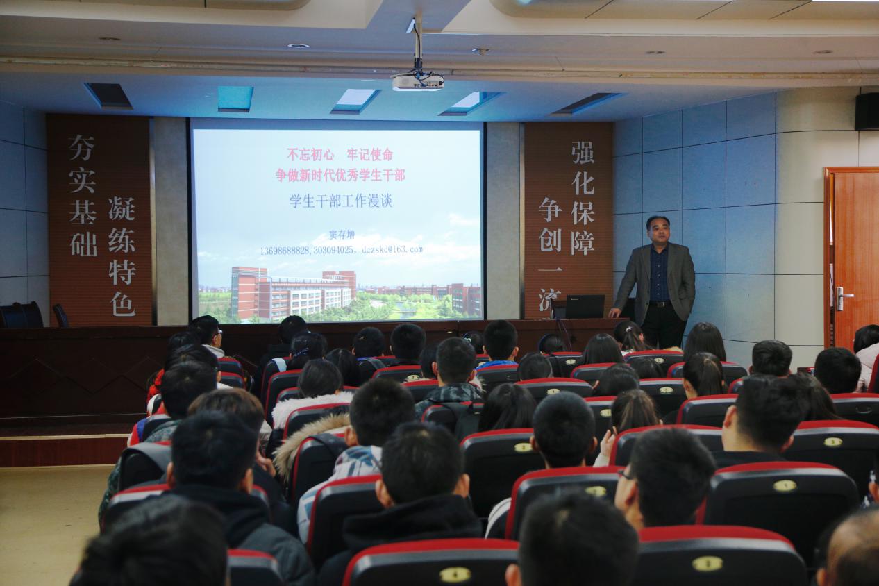 第二期由院党委副书记窦存增担任主讲人,窦书记以“不忘初心、牢记使命,争做新时代优秀学生干部”为主题,从何谓学生干部、学生干部的初心和使命、学生工作理念以及对学生干部的几点建议四个方面为学生们做了精彩的报告。窦书记在报告中讲到,学生干部的身份首先是一名学生,在学习和生活中应先达到一名普通学生的要求,然后提升工作的综合能力、心理素质和团队意识,在思想和学风上做好引领作用。在谈到学生干部的初心和使命时,窦书记讲到,学生干部的初心应该是服务他人、发展自己,使命是为完成党的使命而成为德智体美全面发展的社会主义建设者和接班人。此外,窦书记还详细讲述了学院的学生工作理念,并对学生干部在今后的学习、工作和生活中提了几点建议。
