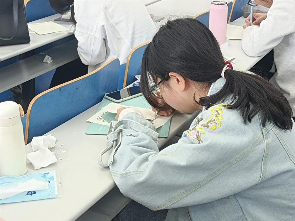 为让同学们更直观、更全面地了解剪纸传统文化,4月18日,必赢3003no1线路检测中心刀下飞花剪纸社举办了“纸上雕花,邂逅光影”第二期活动,此次活动由剪纸社社长胡洁主持,主要内容是学习制作纸雕灯。活动伊始,胡洁首先向在场同学科普纸雕灯的相关知识,她介绍纸雕灯是一种利用剪纸的镂空技术,通过不同层的剪纸作品的叠加,形成的一种剪纸工艺品。随后,胡洁向在场同学展示制作纸雕灯需要用到的材料工具,同时介绍使用剪纸工具时要注意的几点事项。科普结束后,主持人给大家提供剪纸模板进行制作学习。大家互相交流学习,讨论纸雕灯的制作技巧,其乐融融,在一刀一刻中体验纸雕灯的乐趣,领略到非遗剪纸艺术的魅力火花,体现出刀下飞花剪纸社的和乐氛围。