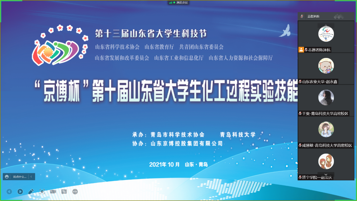 10月31日,第十届山东省大学生化工过程实验技能竞赛决赛在青岛科技大学落下帷幕。由于疫情防控的原因,本次决赛采用线上形式进行。比赛自10月8日发放竞赛题目起,共历经20余天的初赛作品评审、复赛答辩、精馏仿真、实验技能操作等综合评审环节,最终我院化学工程与工艺19级杨梦露团队获得一等奖,王淑团队、王明霞团队、殷宪邦团队和刘江龙团队获得二等奖,另有四支团队获三等奖。比赛由化工系张治山、徐冬梅和高军等老师指导。