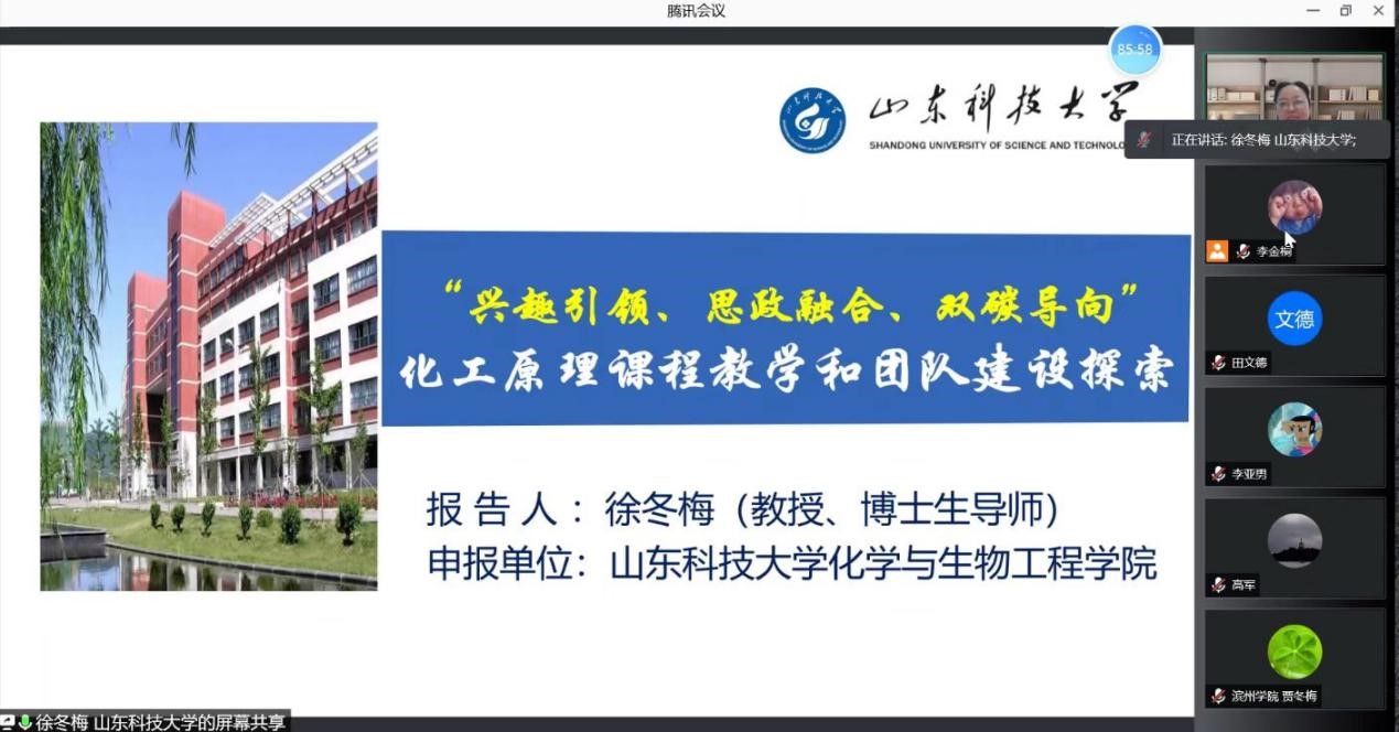 在竞赛期间,由山东省大学生化工过程实验技能竞赛委员会、化工过程国家级实验教学示范中心(青岛科技大学)联合主办的“全省化工专业一流课程线上教学研讨会”在10月31日下午召开。受组委会邀请,我院徐冬梅教授在会议上作了题为“兴趣引领、思政融合、双碳导向”化工原理课程教学和团队建设探索的一流课程建设专题报告,和参会的50多位专家分享了我校在化工原理课程和一流课程建设方面的成果和经验,取得了良好的交流效果。