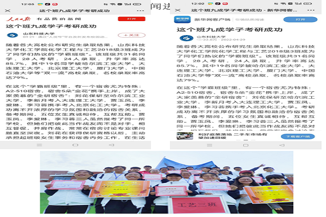 2022年化学工程与工艺专业的本科生的考研升学率率和就业率位居学校前列,其中化工18-3班的升研率高达85.7%,且79%的以上被985或211高校录取,该学霸班级的先进事迹被人民日报、新华网和校新闻网作为品质新闻进行了跟踪报道。