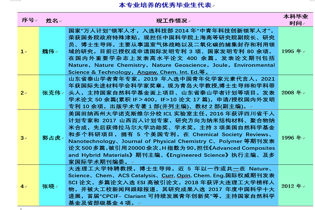 专业的发展离不开几十年来全体化工人兢兢业业地付出和坚持不懈的言传身教,教师团队始终坚持“以本为本”的基础地位,以立德树人理念为引领,以区域与国家需求为导向,以工程教育专业认证为抓手,不断深化本科教育教学改革,专业人才培养效果突出,所培养的专业人才如雨后春笋不断涌现,成长为国家和社会的骨干和有用人才。到目前为止,已经为国内外高校、企事业单位培养了大批化工专业技术人才,毕业生在各行业取得了卓越的成就,成长为生产、科研与工程设计岗位的技术骨干和管理者,其中代表性的有: