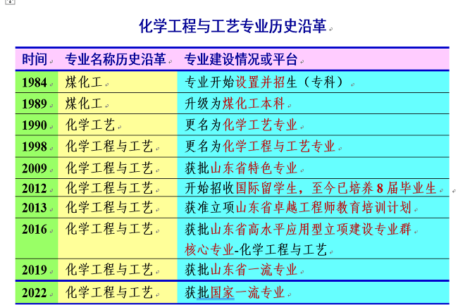 化学工程与工艺专业自1984年开始设置并招生,历经30多年的发展和内涵提升,先后获批山东省特色专业、山东省高水平立项建设核心专业、山东省一流专业和国家一流专业。专业的历史沿革如下。