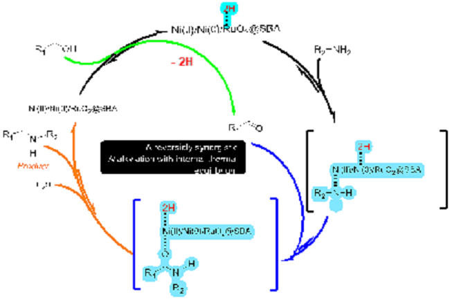 课题组合成了系列催化剂,通过筛选,发现当利用Ni(Ⅱ)/Ni(0)/RuO2(图1)可以高效地协同催化醇和胺的借氢烷基化反应。机理研究表明,N-烷基化反应为可逆级联反应,这是首次此类报到,通过控制反应过程中的水的生成可大幅提高产物收率,并且因为是协同可逆反应,在传统的醇与伯胺反应中选择性不高,产率有待改善等现象在该协同催化“借氢反应”中不复存在,选择性达到理想值100%。
