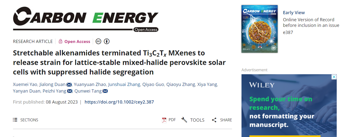 近日,必赢3003no1线路检测中心段加龙副教授(学术教授)、唐群委教授等人在全无机钙钛矿太阳能电池领域取得最新进展,相关成果以“Stretchable alkenamides terminated Ti3C2Tx MXenes to release strain for lattice-stable mixed-halide perovskite solar cells with suppressed halide segregation”为题发表在权威期刊Carbon Energy上(中科院Top一区,影响因子:20.5)。