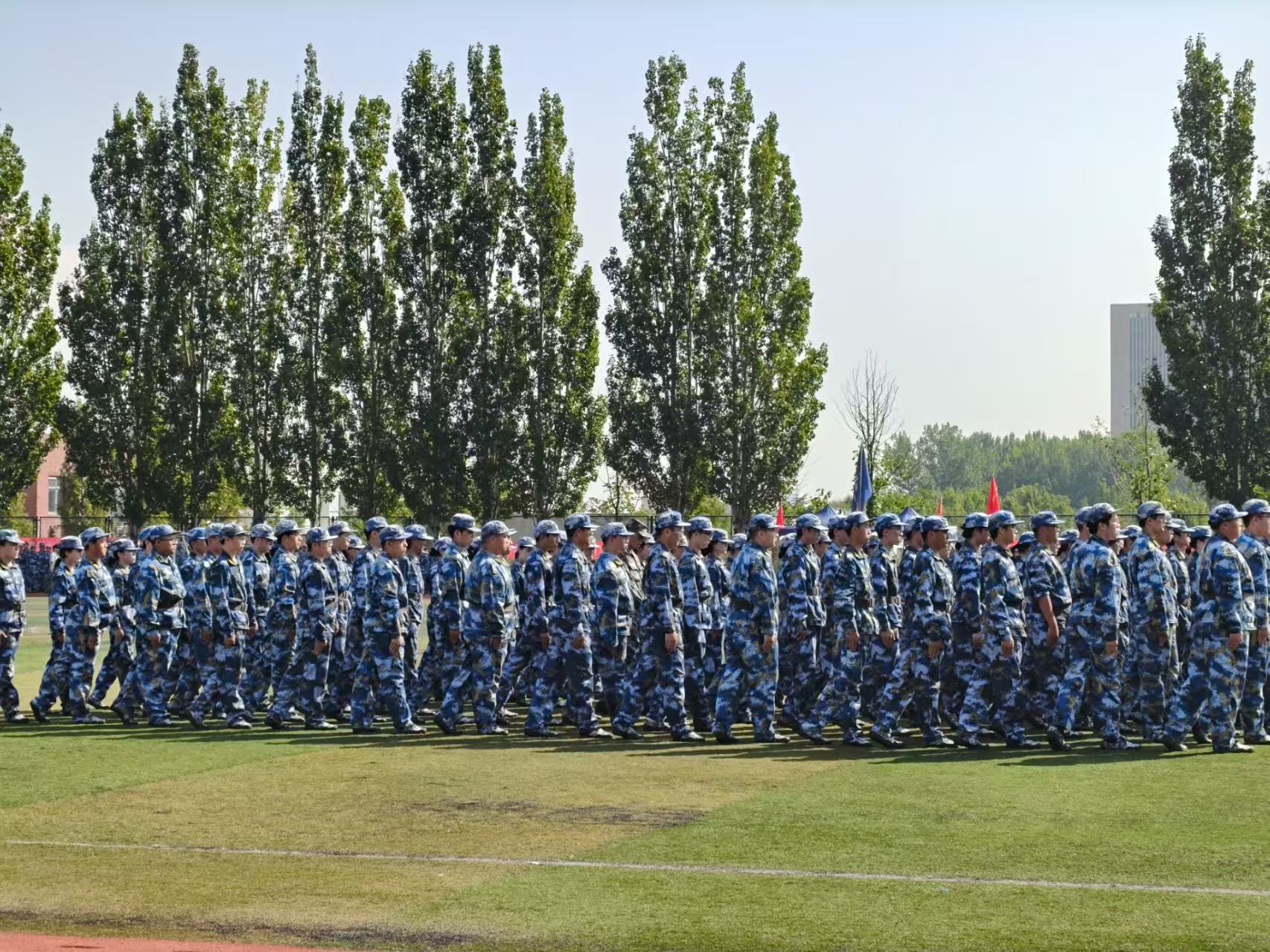 初始训练重点围绕队列动作与轻武器射击展开,学员们在校训练场反复演练正步与立定、跑步与立定、齐步与步伐变换等课目,动作渐趋整齐划一,团队默契持续深化。随后训练内容向实战化延伸,陆续开展战术训练、战场医疗救护和核生化防护等专项训练。在教官的示范与指导下,学员们认真学习防护装备穿戴、战场救护流程和基本战术动作,在模拟情境中进一步强化应急处置能力和国防安全意识。