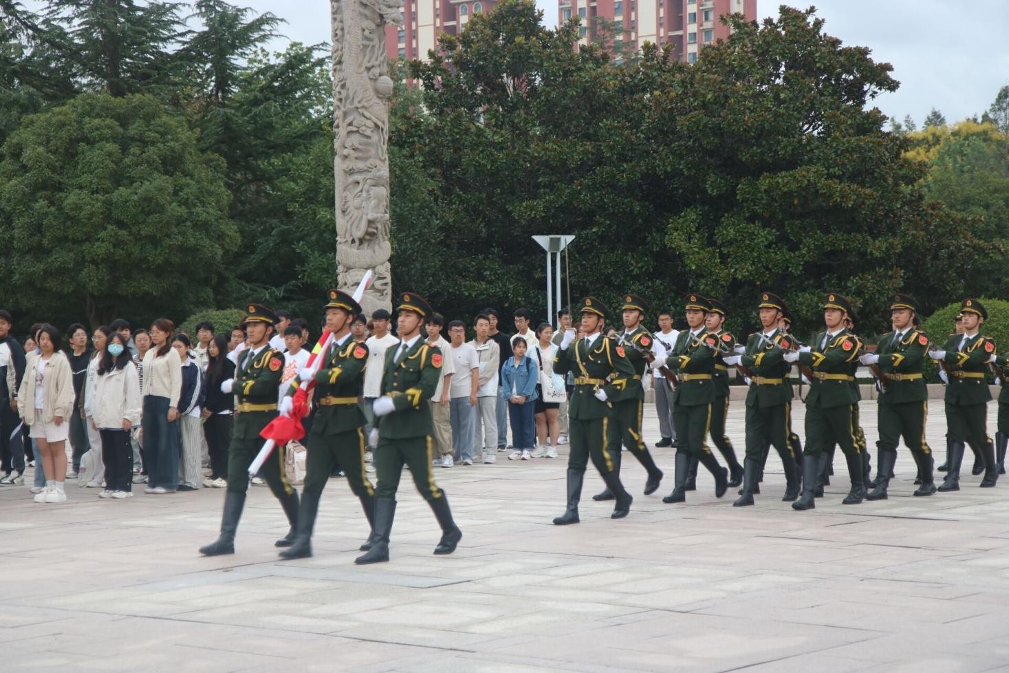 仪式开始,国旗护卫队迈着铿锵有力的步伐护送国旗入场。在雄壮的国歌声中,鲜艳的五星红旗冉冉升起,全体师生肃立行注目礼,齐声高唱国歌。