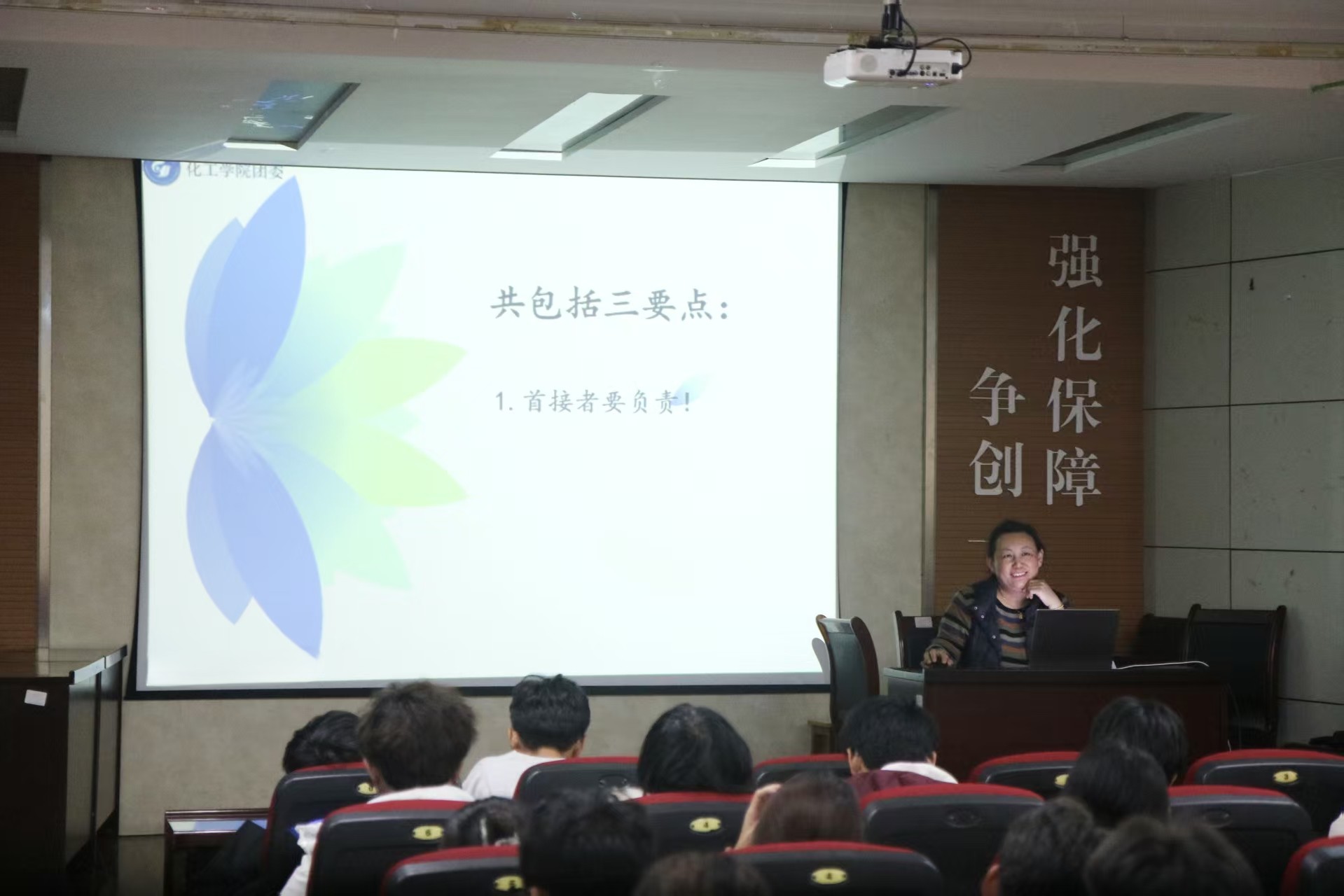 李玲玲老师以“服务他人,成就自我”为主题展开培训,结合具体案例与学生工作场景,系统讲解学生干部应具备的基本素养,并强调“认真从小事开始”,提醒大家养成严谨细致的工作作风。