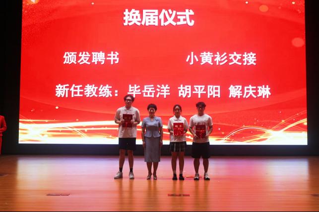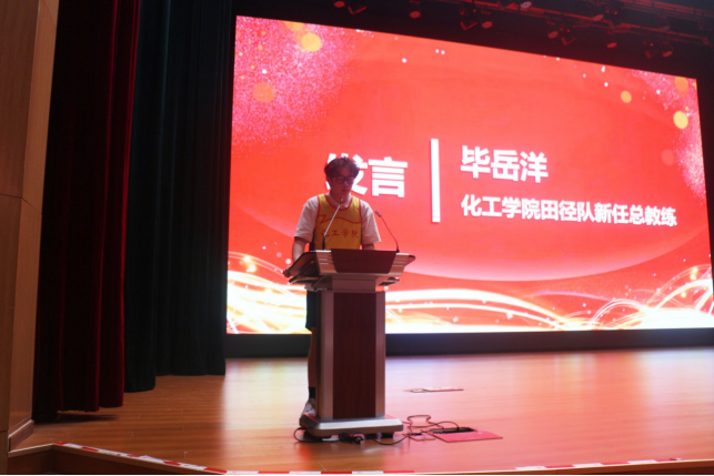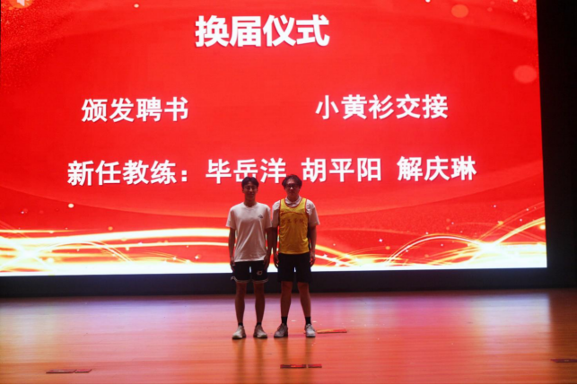 在田径队换届仪式上,田书记为新任田径队教练毕岳洋、胡平阳、解庆琳颁发聘书。老教练王浩林和新教练毕岳洋进行了小黄衫交接仪式。王浩林在赛季总结发言中回顾了一年来田径队的辛苦付出和累累硕果,对关心支持田径队发展的领导老师、同学朋友表示衷心的感谢,对新一届田径队续写辉煌充满期望和信心。毕岳洋在就任发言中表示,将以激情和热爱肩负起教练的责任和使命,带领田径队走得更高更远,有信心也有决心将化工田径精神发扬光大,让化工小黄衫的光辉在阳光下闪耀,让“化工化工 谁与争锋!”的呐喊声响彻赛场。