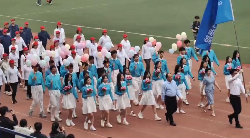 闭幕式后,化工田径队的健儿们身穿“小黄衫”,一句句“化工化工,谁与争锋”的口号响彻着整个运动场。队员们迈着整齐的步伐来到主席台前向领导老师鞠躬致敬,向现场观众表达感谢,化工健儿们成为了风雨操场最美的风景线。