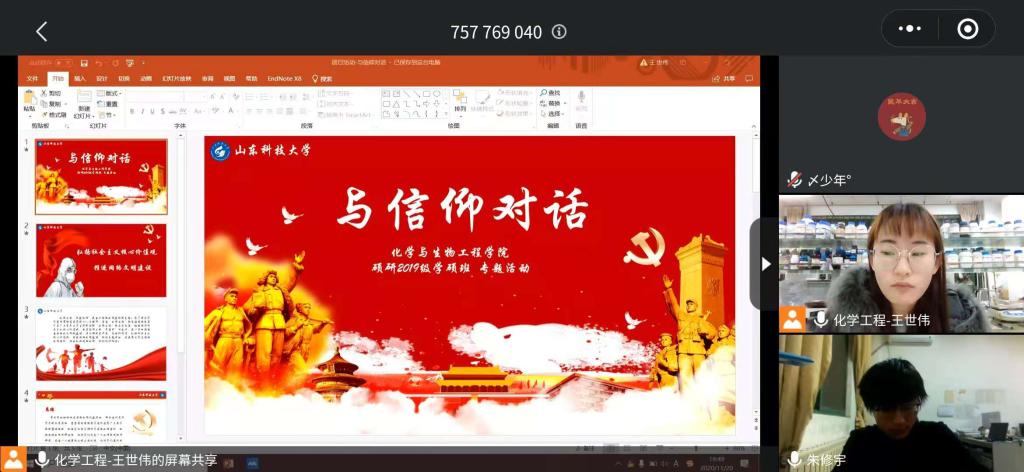 11月20日,硕研2019级学硕团支部开展“与信仰对话”线上主题团日活动。活动由团支书王世伟主持,该团支部所有团员参加。活动伊始,王世伟向所有在线同学讲述了共产主义信仰的内容和意义,并为大家播放了一些老一辈革命家和新时代楷模们的事迹,引发了每个团员在内心深处“与信仰对话”的强烈共鸣。随后,进入自由讨论环节,同学们踊跃发言,纷纷列举当前一些大学生信仰缺失的事件,并表达了作为一名共青团员,自己要坚定共产主义信仰的决心。其中,该团支部副团支书、班长刘帅说道:“近期在上校党课,通过系列学习,加深了对于共产主义信仰的理解,而且在学习之余,自己常常自省,与信仰对话,更加坚定了为共产主义奋斗的信仰。”线上主题团日活动在和谐的气氛中结束,团员同学们纷纷表示,要常与信仰对话,踏实学习,增长才干,把坚定信仰和奉献祖国落实到实际行动中去。