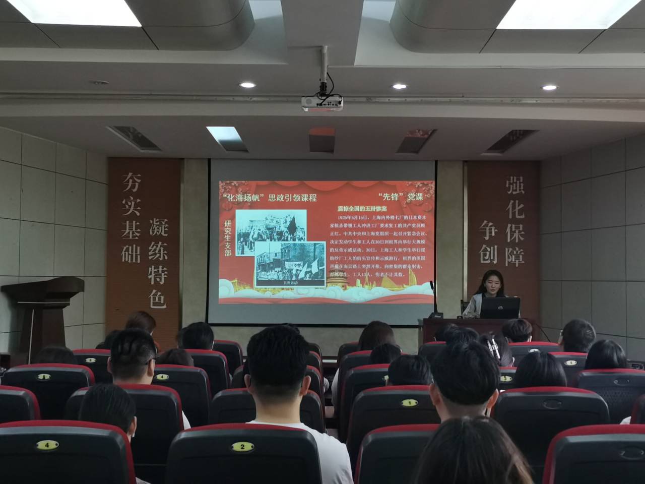 5月25日下午,必赢3003no1线路检测中心研究生党支部“先锋”党课进行第七讲。王娜同志担任主讲,这次党课的主题为“1925革命浪潮滚滚来——中国共产党引领大革命高潮的到来”。支部全体党员到场聆听。王娜讲道,1925年1月,中国共产党在上海举行第四次全国代表大会,对党在当时要解决的一些基本问题作了阐述和回答,而最具历史意义的是明确提出了无产阶级在民主革命中的领导权问题。随后,五卅惨案激起了全上海乃至全中国人民的极大愤慨,在中国共产党的领导和推动下,五卅运动的狂飙迅速席卷全国,各阶层广大群众积极参加反帝爱国运动,打开反对帝国主义和封建军阀的革命新局面。她说,中国共产党领导的五卅运动,是中华民族直接反抗帝国主义的伟大运动,它大大促进了群众的觉醒,显示了各革命阶级、各阶层民众在无产阶级领导下联合斗争的巨大威力,给帝国主义和军阀势力一次前所未有的打击,并初步积累了领导反帝斗争的经验。课后,党支部书记易凡老师强调,作为一名共产党员,要以正确党史观为引领,用党的奋斗历程和伟大成就鼓舞斗志、明确方向,用党的光荣传统和优良作风坚定信念、指导行动,以更加昂扬的姿态为社会主义现代化国家建设贡献力量。