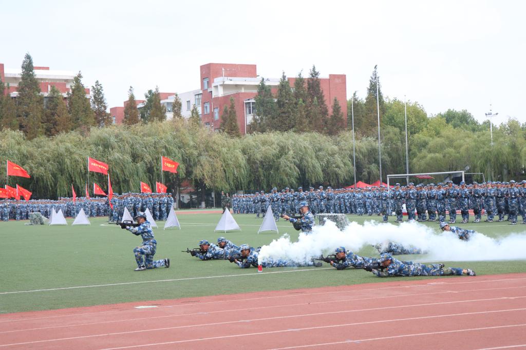 仪式上,化工新生军训方队迈着整齐的步伐,喊着响亮的口号,齐步换正步,昂首走过主席台。队列行进之后,队形变换、擒敌拳、匕首操、战术表演依次上演。表演方队伴随着鼓声,依次摆出党徽、1921、2021字样和校徽、1951、2021字样,向建党一百周年、建校七十周年献礼。由500名男生组成的擒敌拳方队一令一动,气势恢宏;500名女生组成的匕首操方队手持匕首,动作如行云流水,展现飒爽英姿。战术综合演练、战术手语、红蓝对抗的表演更是让人叹为观止,现场掌声不断。