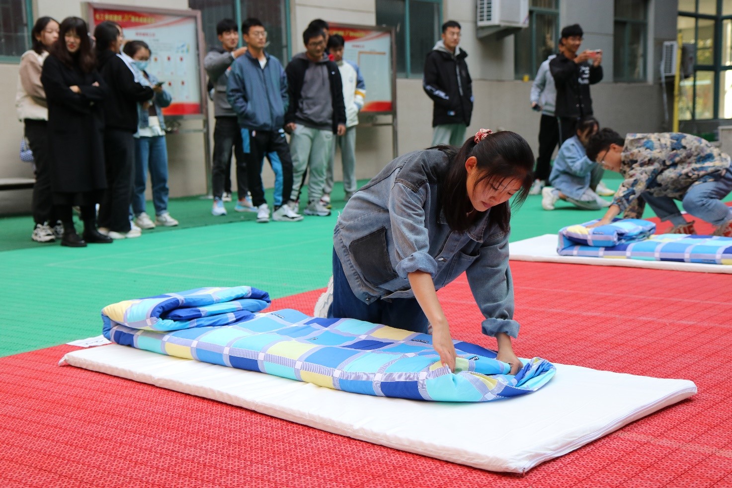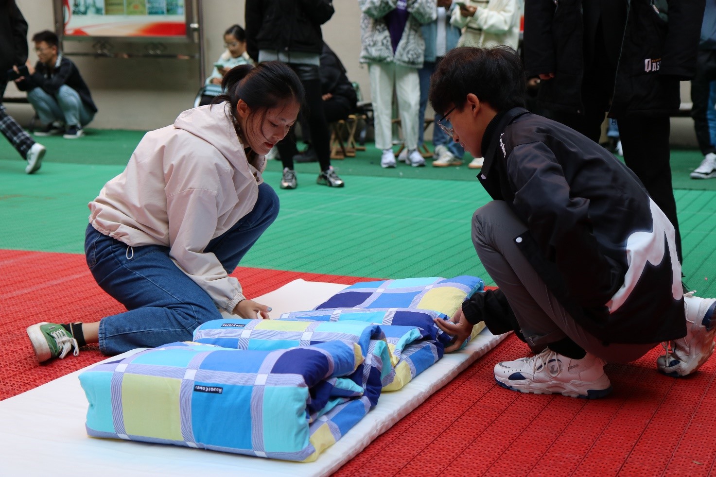 此次比赛共分为四轮:针锋相对(个人叠被),黑夜作战(蒙眼叠被),男女搭配、干活不累(合作叠被),眩晕大作战(旋转后叠被)。比赛开始,各班代表队喊出响亮的口号将全场的气氛带入高潮。参赛选手斗志昂扬,一床床松软的棉被在他们手中变成一个个“豆腐块”,现场观众为支持的队伍呐喊助威,游戏环节更是为比赛增添了欢乐与轻松,现场气氛热烈。