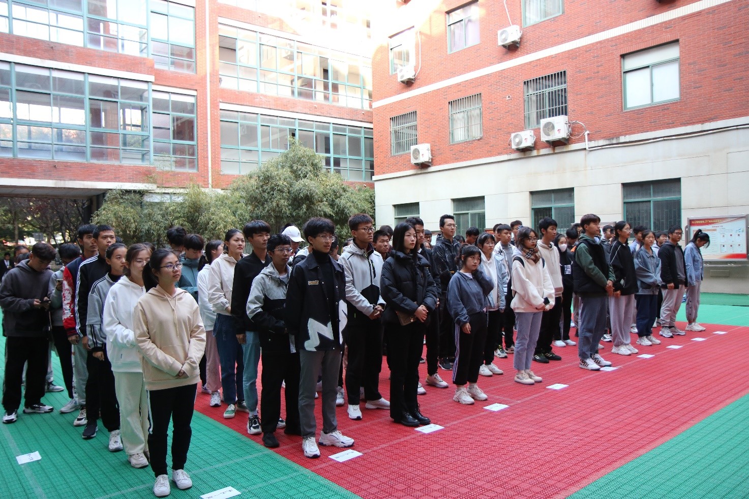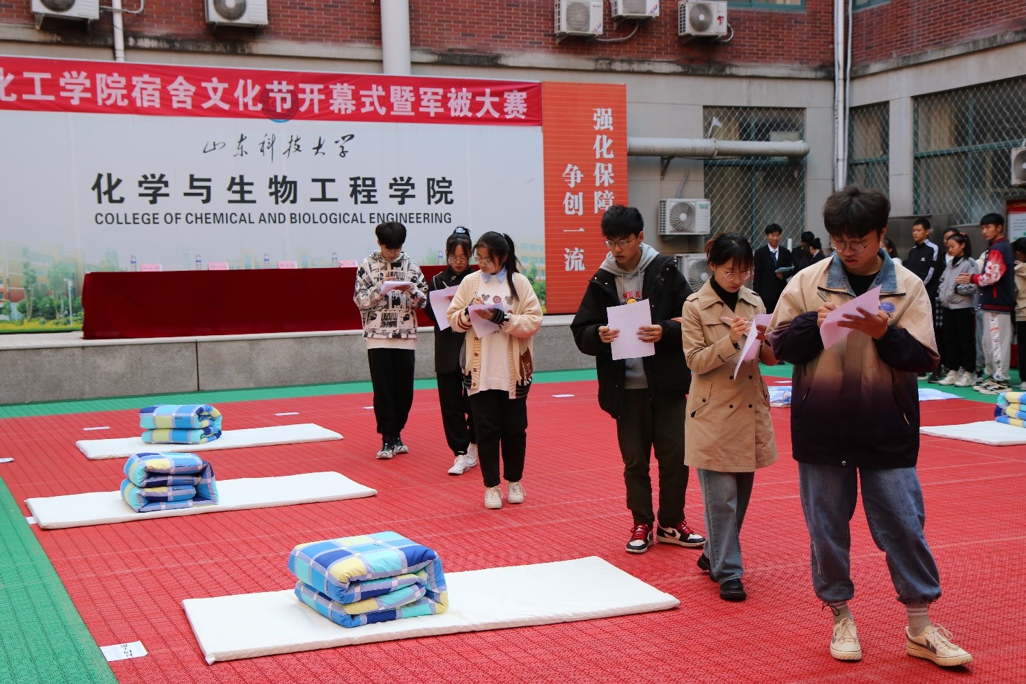 为建设良好的宿舍文明,营造良好的宿舍环境,丰富同学们课余生活,提高同学们的自律意识和自我管理能力,10月23日,由必赢3003no1线路检测中心团委主办、自律会承办的宿舍文化节开幕式暨军被大赛在J2文化广场举办。必赢3003no1线路检测中心学工办主任(团委书记)易凡、辅导员满灏出席开幕式,院学生会主席刘娟,心健联会长石林源,自律会主任卢冰洁,安全、材料、经管学院自律会负责人出席大赛并担任评委,2021级新生参加此次比赛。
