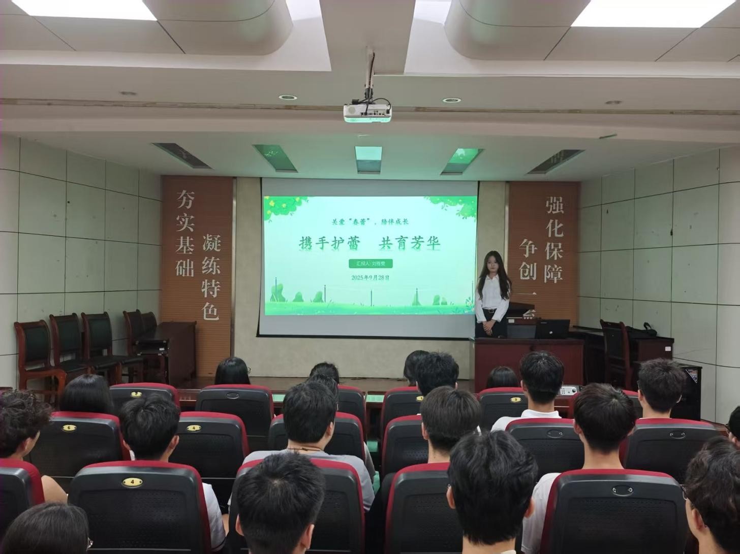 2025年9月28日,必赢3003no1线路检测中心“关爱‘春蕾’,陪伴成长”主题团课在J2-104召开,作为该系列主题团课的第二讲,此次课程的主题是“携手护蕾 共育芳华”,由“护蕾”志愿者刘雅雯主讲,全体学生会成员参加。