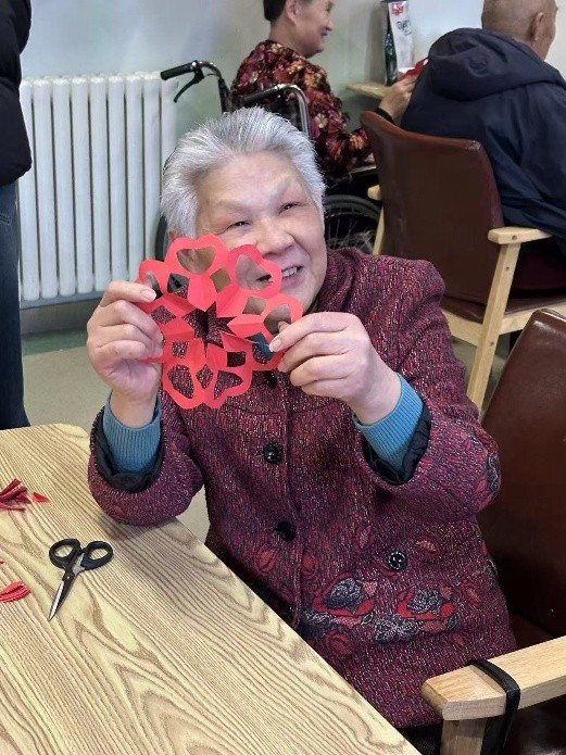 活动现场,剪纸社的同学们耐心细致地向老人们介绍了剪纸艺术的历史渊源和基本技法。在“手把手”的教学互动中,老人们热情高涨,认真聆听、积极尝试。红纸在指尖翻折,剪刀在手中游走,不一会儿,一幅幅寓意吉祥的“福”字窗花、栩栩如生的花卉图案便跃然眼前。活动现场欢声笑语不断,温馨的氛围弥漫在整个护养院。