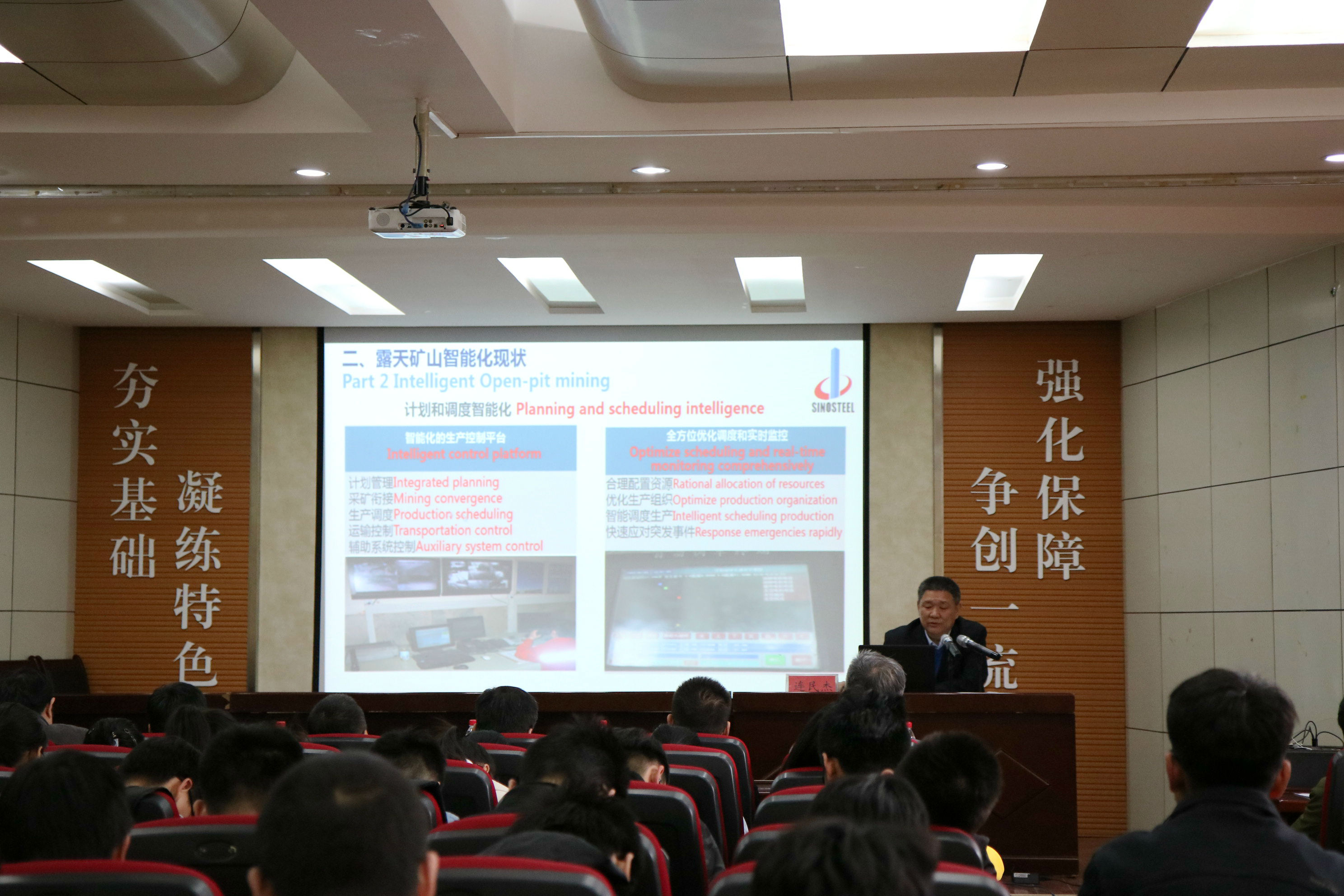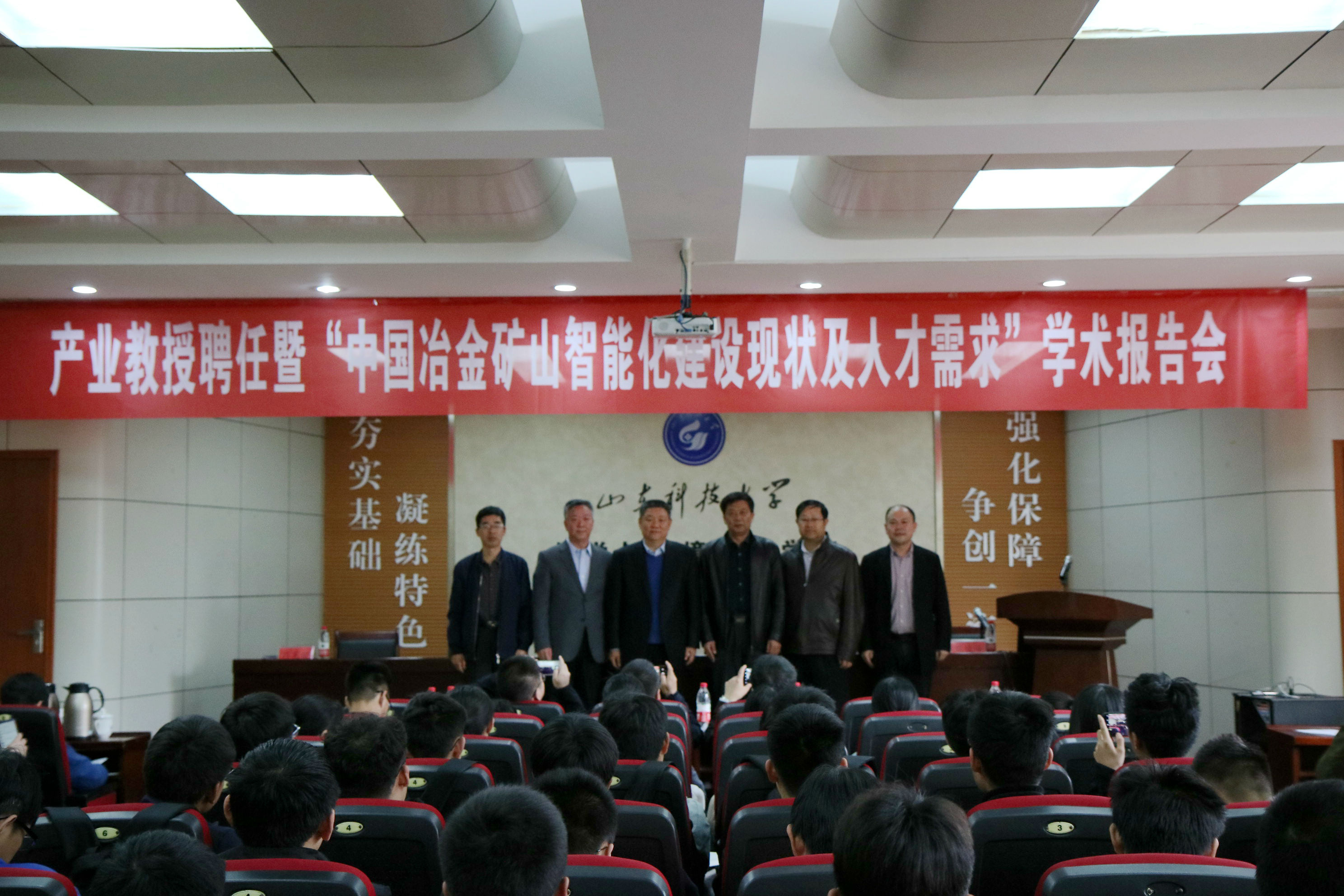 聘任仪式结束后,连民杰教授为现场师生做了一场题为“中国冶金矿山智能化建设现状及人才需求”的学术报告会。连民杰教授从露天矿山、地下矿山、选矿厂的智能化现状与管控系统架构出发,全面客观地分析了我国冶金矿山智能化建设现状。用通俗朴实的语言,讲解了有关矿山智能化的专业知识。连教授结合自己丰富的专业知识与工作阅历,对比了国内外矿山企业在智能化建设的发展现状。连教授还就智能矿山管理创新与矿业人才培养方向两方面,对比分析了新旧矿山管理的优缺点,同时指出智能化矿山对人才的需求提出了更高的标准,即一专多能型人才。他表示我国矿山智能化任重而道远,应抓住新一代信息化、人工智能带来的发展机遇,用智能化建设迎接矿业新的“春天”。报告结束后,师生们在现场提问求教,连教授一一予以耐心解答。在回答“课程安排及学生具体发展方向选择”时,连教授说道:“传统专业知识如同基础,信息化与智能化好比手段,要在自身基础过硬的基础上,更好地发展信息化与智能化。”