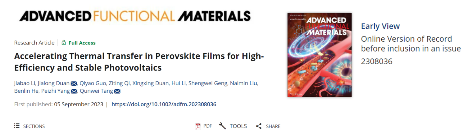 近日,必赢3003no1线路检测中心段加龙副教授(学术教授)、唐群委教授等人在全无机钙钛矿太阳能电池领域取得最新进展,相关成果以“Accelerating Thermal Transfer in Perovskite Films for High-Efficiency and Stable Photovoltaics”为题发表在权威期刊Advanced Functional Materials上(中科院Top一区,影响因子:19.0)。