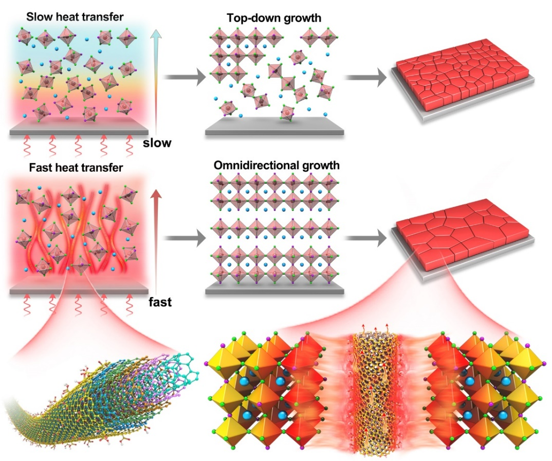 近年来,钙钛矿太阳能电池迅猛发展,其光电转换效率已高达26.1%,与晶硅电池相媲美。然而,电池性能在高湿、高温、氧气和/或紫外线光照条件下的快速衰减阻碍了该类器件的商业化进程,这与快速结晶过程中形成的有害缺陷密切相关。虽然研究人员通过优化制备工艺、界面调控等策略提升了薄膜的质量,大幅降低了薄膜的缺陷态密度,有利于提高晶格抗湿和光稳定性,但仍然无法避免器件在光照过程中产生的热量堆积,从而导致钙钛矿太阳电池的性能迅速下降。因此,开发一种可行的策略来加速从器件到环境的散热过程,以最大限度地提高钙钛矿太阳电池的功率输出和长期稳定性是一项挑战。