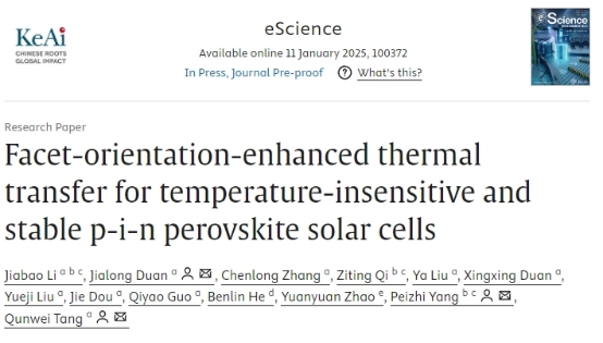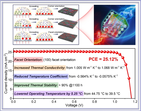 钙钛矿太阳能电池因具有光电转换效率高和制备工艺简单等优势已成为太阳能光伏领域的前沿技术。但钙钛矿太阳能电池的长期稳定性已严重制约了其商业化进程。大量研究工作聚焦于通过改善钙钛矿薄膜质量以提升晶格稳定性。在实际应用过程中,钙钛矿太阳能电池的温度会随着持续光照逐渐上升,尤其是在光照比较充足的季节,这对最大功率输出和稳定性构成挑战。针对这一行业共性关键问题,山东科技大学化学与生物工程学院段加龙&唐群委等人创新性地研究了钙钛矿薄膜不同晶面结构与热导之间的依赖关系,揭示了混合阳离子钙钛矿中晶面依赖的热力学特性背后的机制。研究结果表明,(100)晶面具有比(110)和(111)晶面更高的热导率。通过埋入式和体相改性精确控制(100)晶面取向,目标钙钛矿薄膜的热导率可以从1.005提高到1.068 W m-1 K-1,加速了热量传输和散发,使得钙钛矿太阳能电池的平衡温度降低了5.25 oC。该项工作不仅获得了25.12%的光电转换效率,同时也表现出非常优异的热稳定性。相关成果发表在eScience期刊上,山东科技大学为第一单位,联合培养博士生李佳保为第一作者。
