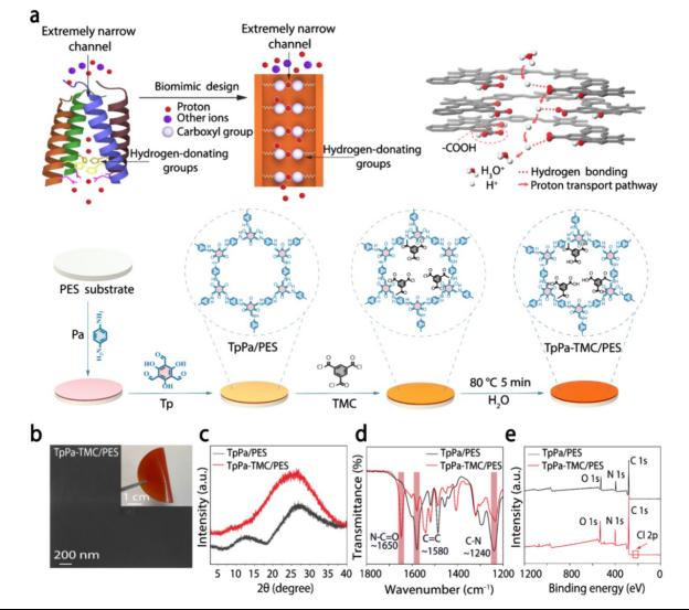 本研究受生物质子通道的结构与表面化学性质启发,提出了一种构建含高性能人工质子通道的共价有机框架(COF)膜的方法。该膜被特意设计为非晶态结构,可消除大部分纳米级孔隙并对离子产生高空间位阻;同时,通道经供氢基团功能化修饰,使质子能够通过跳跃机制快速传导。有趣的是,我们发现水合质子的存在会进一步阻碍其他离子迁移,从而自我放大质子的选择性。实验表明,该膜对有毒重金属离子的质子选择性高达104,显著优于商用酸回收膜。其渗透性可与生物质子通道相媲美。此类膜可通过简单的扩散渗析工艺从工业废盐水中回收酸,且无有毒离子泄漏风险。此外,质子扩散释放的熵还可用于发电,其功率密度超越大多数已报道的渗透能收集膜。